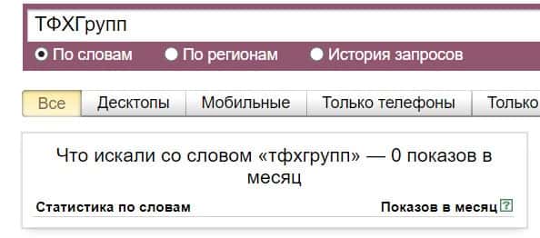 Название бренда на русском языке без пробела "ТФХГрупп", пользователи не пытались найти в системе Яндекс ни разу.