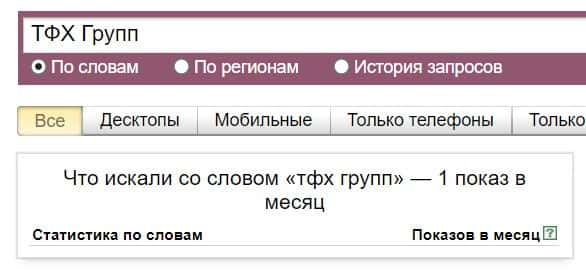 Посмотрим, сколько раз люди искали название бренда "ТФХ Групп" на русском языке с пробелами: результат 1 показ.