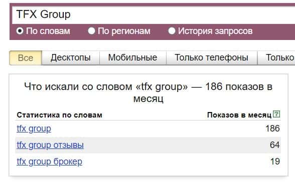 То же название "TFX Group", но написанное с пробелами, люди пытались найти в системе Яндекс 186 раз.