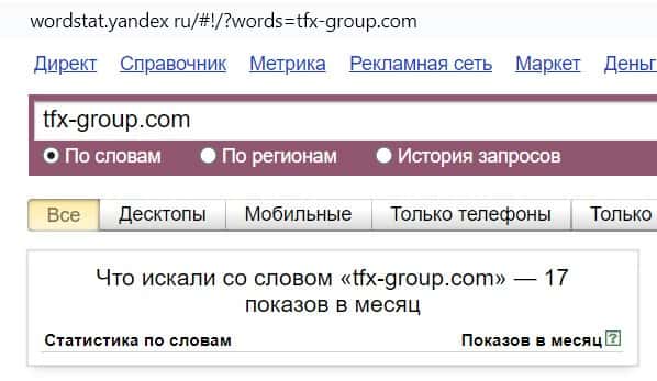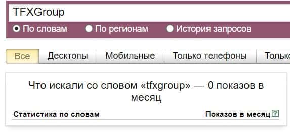 Название мошеннической конторы "TFXGroup", написанное на английском языке, пользователи не искали в системе Яндекс, программа выдает 0 показов.