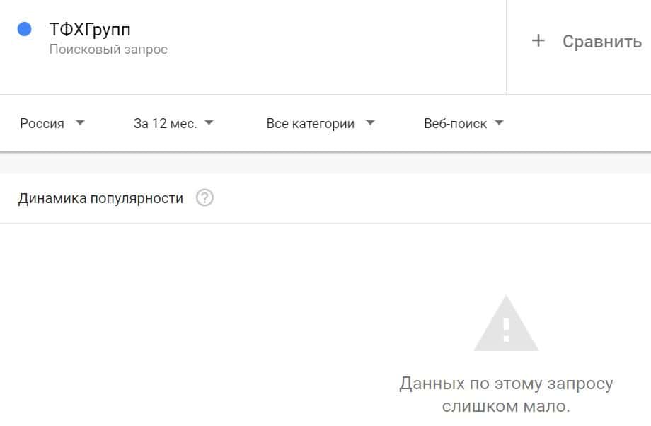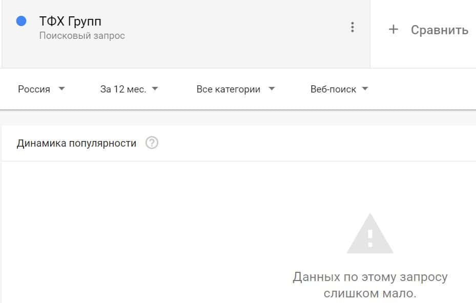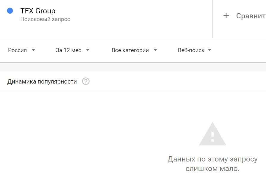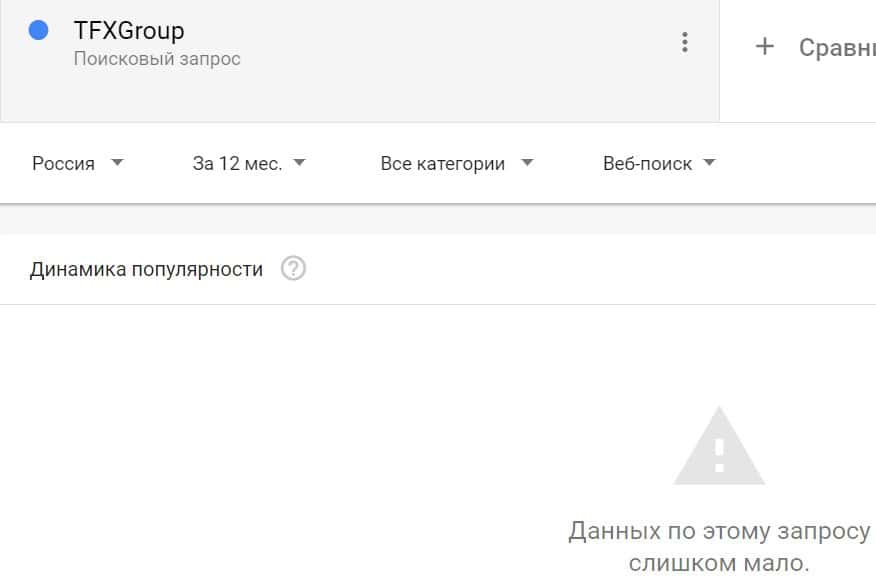 Посмотрим, насколько популярно название бренда "TFXGroup", написанное на английском языке. Данных по этому запросу нет, так как никто не искал этот бренд в Гугл.