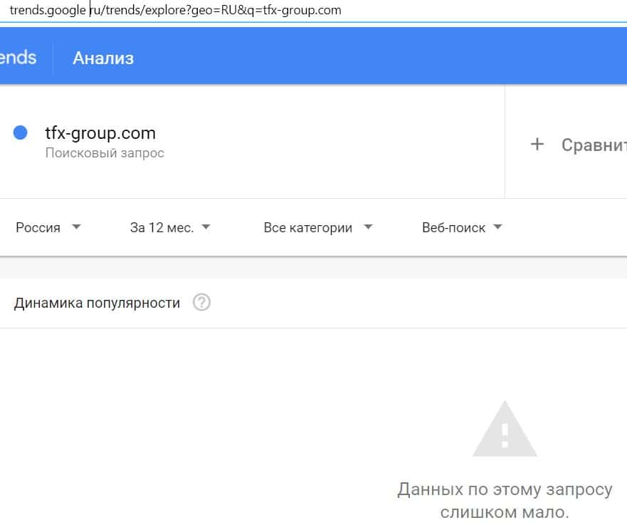 Доменное имя мошеннического сайта "tfx-group.com" вбивали в поисковую систему Гугл слишком редко, поэтому данных по этому запросу практически нет.