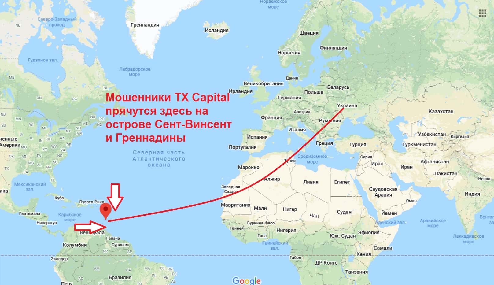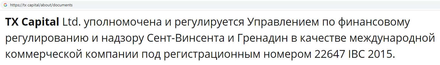 Данный интернет-лохотрон под названием TX Capital принадлежит юридическому лицу, находящемуся в одном из оффшоров на острове Сент-Винсент и Гренадины, где зарегистрировано немалое количество подобных организаций. Это не дает право предоставлять свои брокерские услуги на территории Российской Федерации.