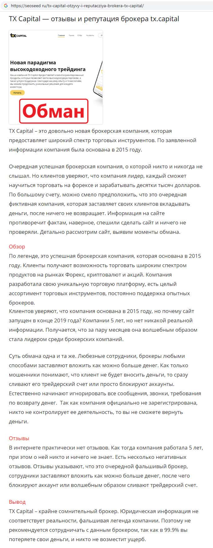 На интернет-ресурсе seoseed ru обнаружена статья о скам-проекте TX Capital. Зарегистрировавшись на сайте шулеров приготовьтесь к тому, что Вы не увидите не только прибыли, но еще и собственных сложенных денежных средств. Это происходит по той причине, что интернет-сервис конторы ТХ Капитал мошеннический.