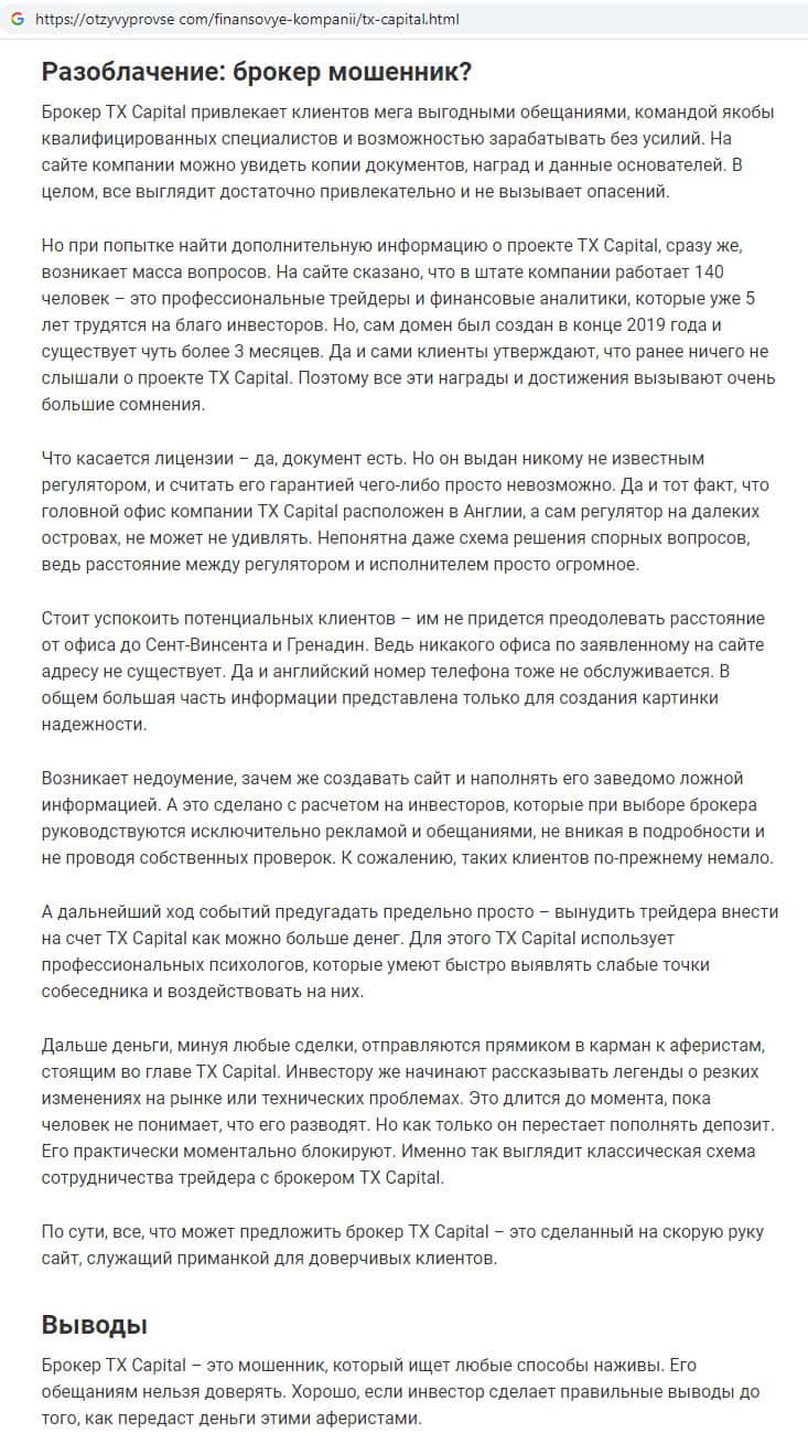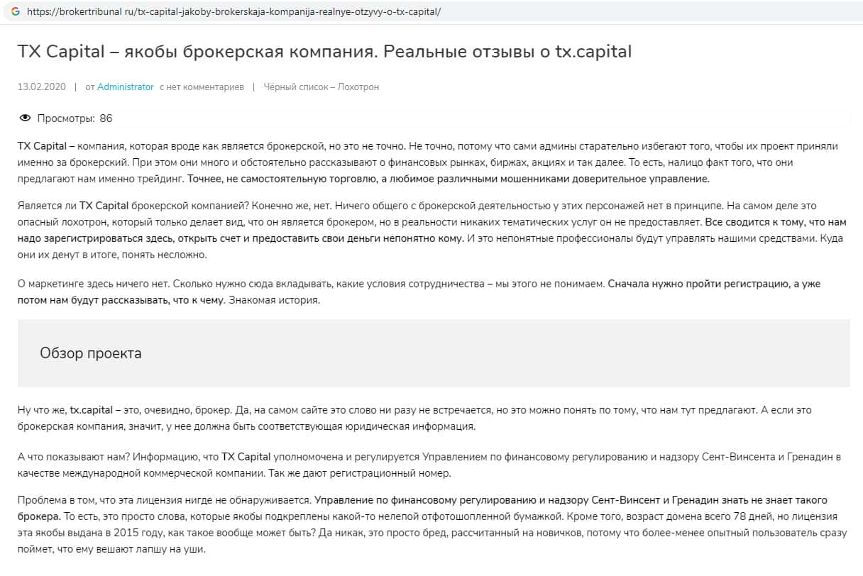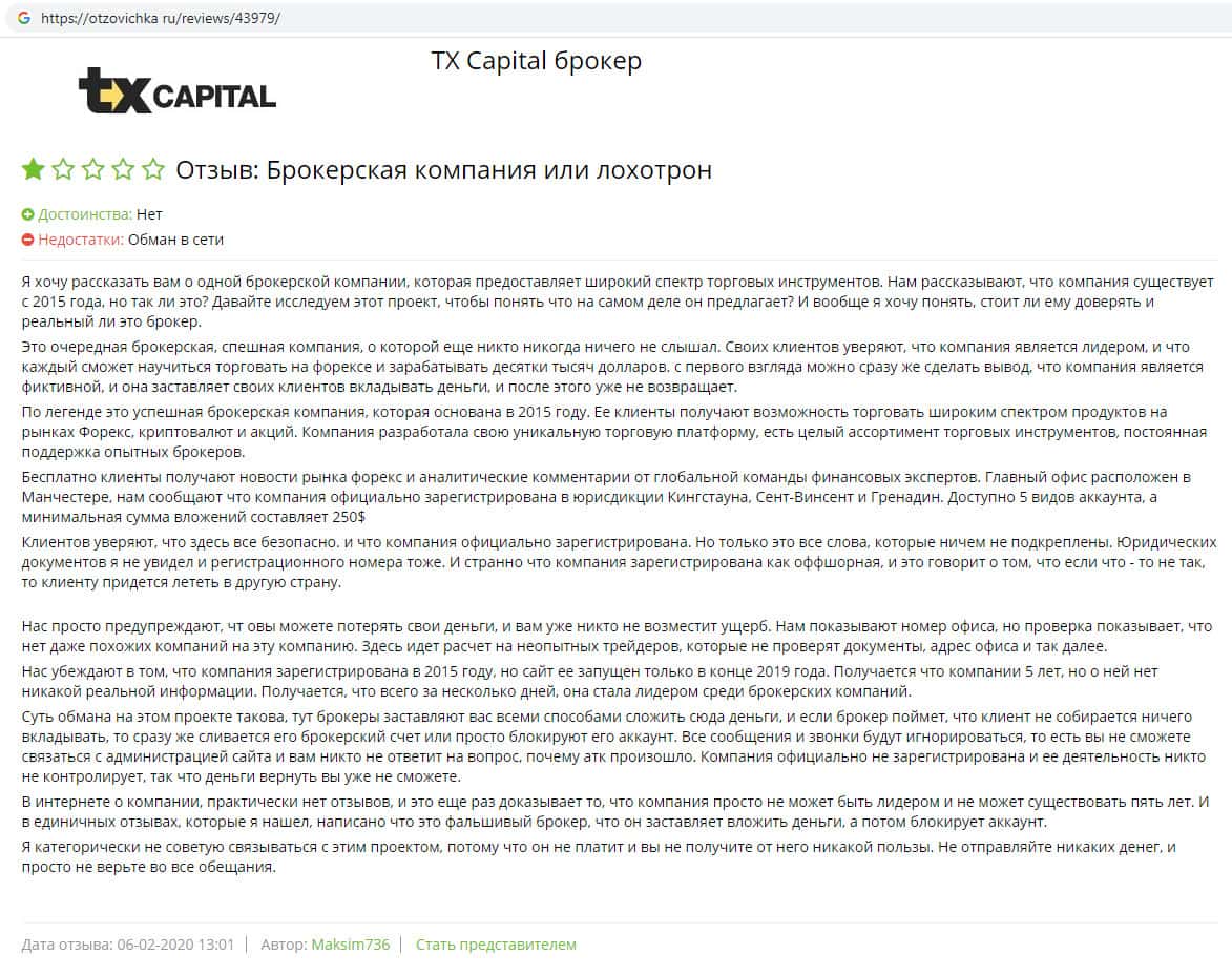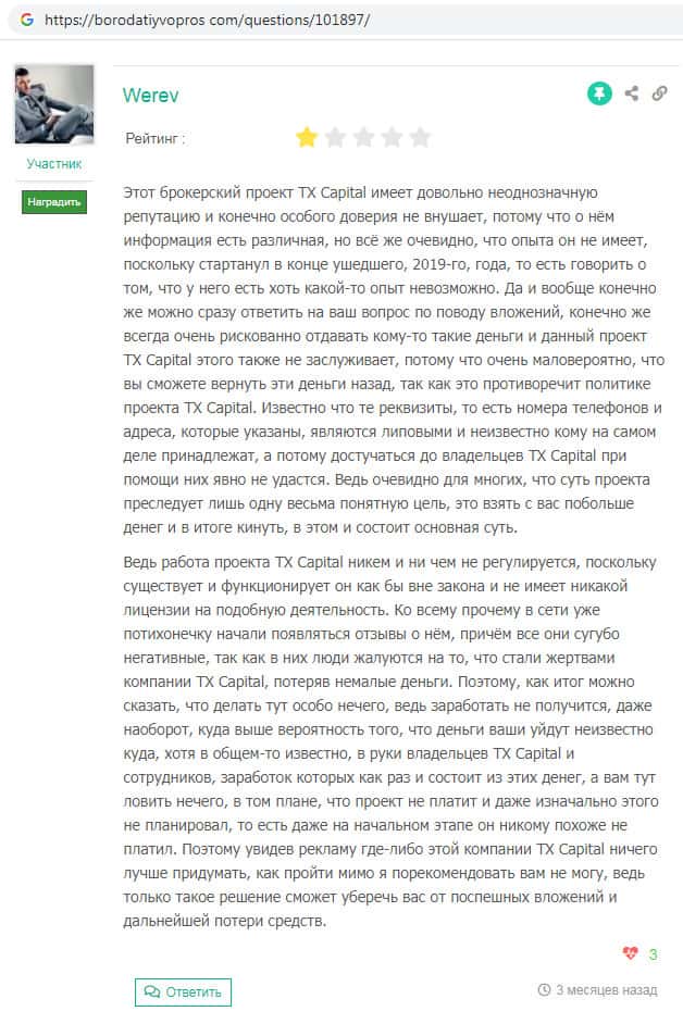 - Скам-организация TX Capital не внушает доверия, поскольку у нее плохая репутация в интернете
