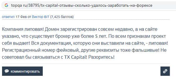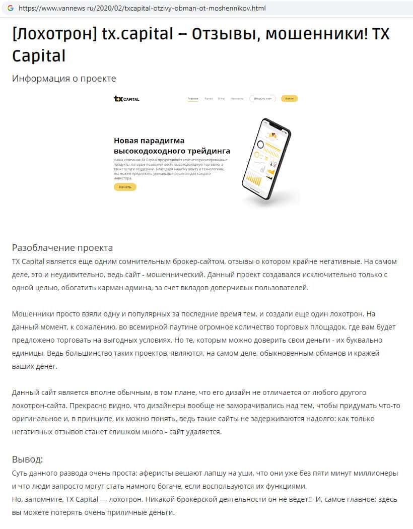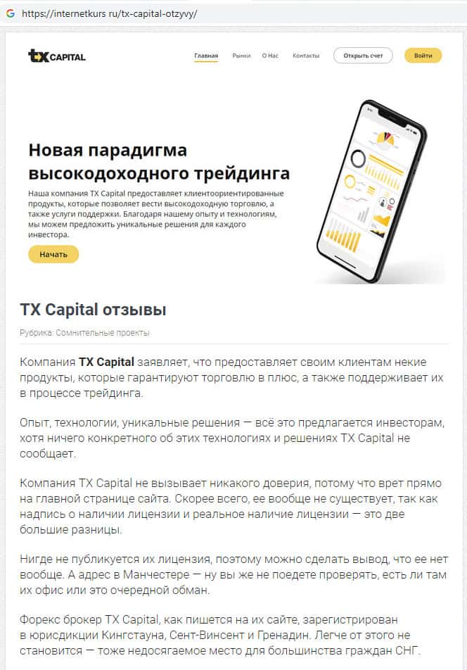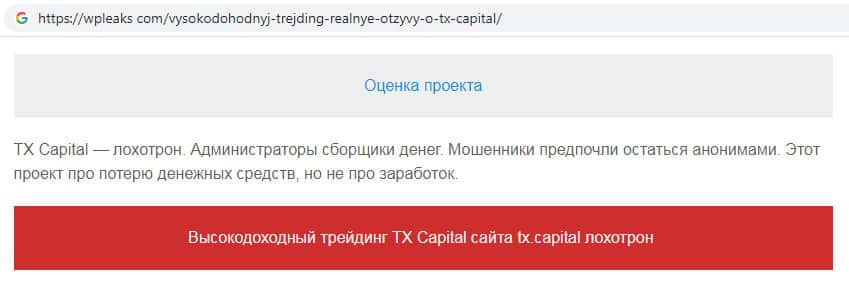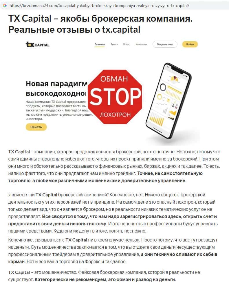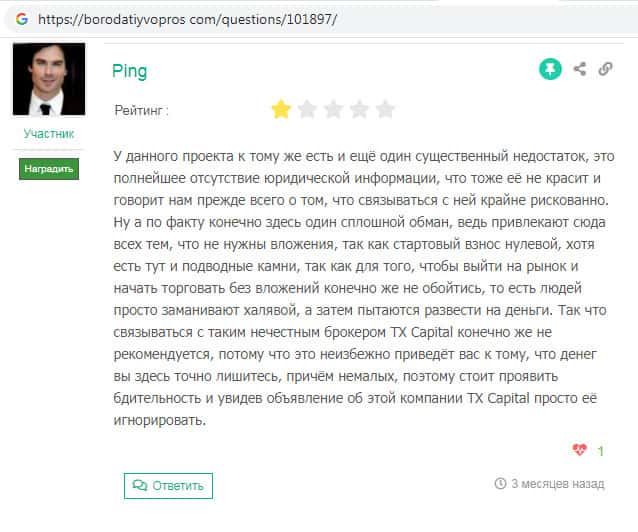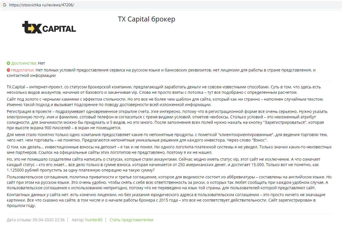 - Скам-организация TX Capital не внушает доверия, поскольку у нее плохая репутация в интернете