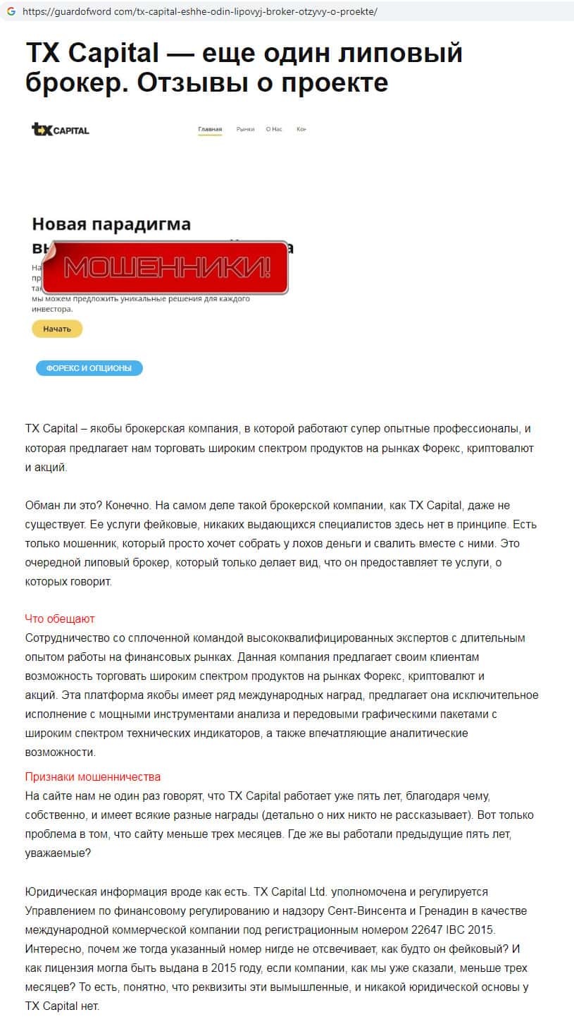 На интернет-портале гуардофворд ком замечена статья-отзыв об аферистах ТХ Капитал, которые указали не правдивую информацию о своей организации на своем официальном сайте, включая контактный номер телефона конторы. Исходя из этого можно сделать вывод о том, что доверять мошенникам TX Capital нельзя !!!