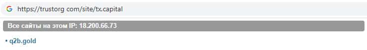 Так же при помощи проверки данной скам-организации на веб-сайте трусторг ком выяснилось, что TX Capital находится на одном ip-адресе с якобы временно неработающим сайтом интернет-лохотрона, а именно с фальшивым обменником. Из этого следует вывод о том, что с сайтом шараги TX Capital вскоре может произойти тоже самое.