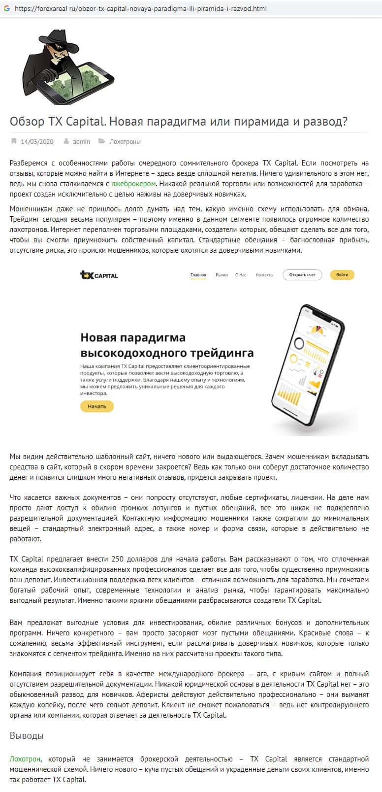 На интернет-сервисе forexareal ru замечена статья-отзыв о мошенниках TX Capital. Первоначальный взнос на депозит составляет 250 долларов, что является первым признаком того, что Мы имеем дело с аферистами. Подобных скам-проектов в интернете достаточно много, поэтому регистрироваться на сайте шараги ТХ Капитал не рекомендуем !!!