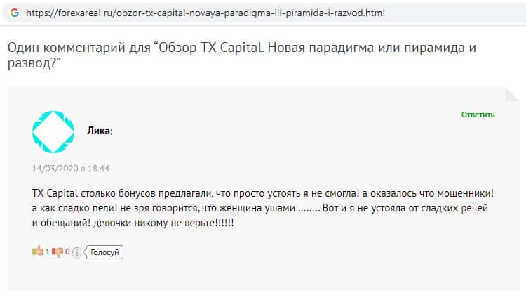 На веб-сайте форексареал ру найден отзыв о шулерах ТХ Капитал. Автор данного комментария некая Лика пишет, что ей предлагали невероятное количество бонусов для якобы успешной торговли, из-за чего она и повелась на развод. В результате аферисты TX Capital кинули ее на деньги, как впрочем поступают всегда.