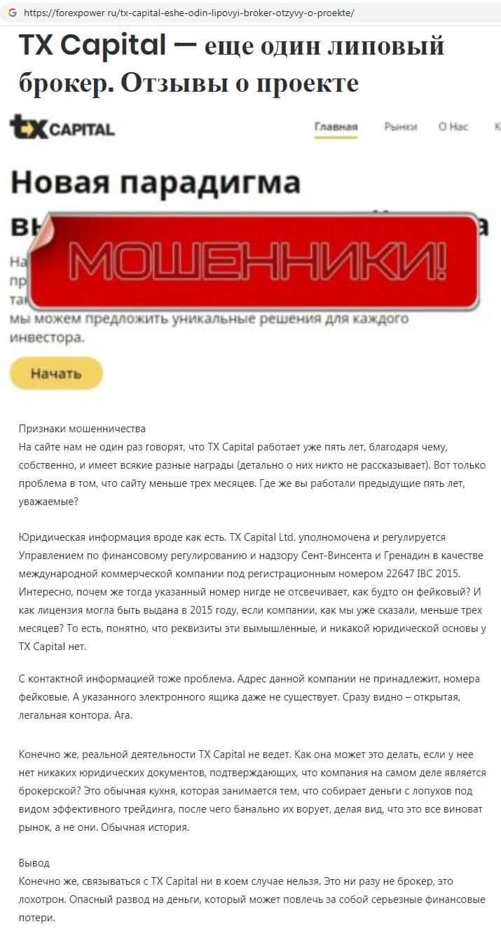 На онлайн-ресурсе forexpower ru обнаружена статья о жульническом проекте TX Capital, на сайте которого отысканы все признаки мошенничества. Связываться с подобными скам-организациями нельзя, поскольку в результате такой деятельности Вас ждут финансовые потери. Будьте бдительны !!!