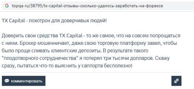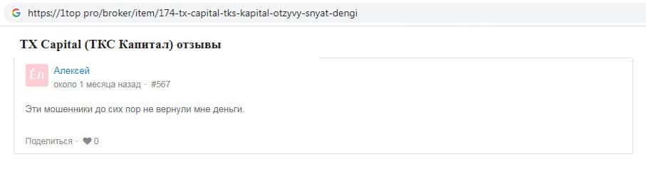 На веб-сервисе 1top pro отыскан комментарий о мошенниках TX Capital, автор которого некий Алексей уведомляет пользователей всемирной паутины о том, что с данной конторой необходимо быть осторожнее и лучше с ними не связываться, поскольку они до сих пор не вернули ему деньги.