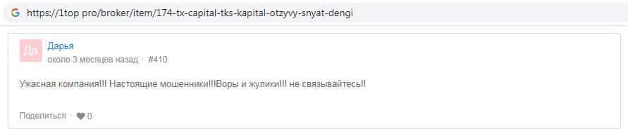 На веб-ресурсе 1топ про обнаружен отзыв о жуликах ТХ Капитал, автор которого некая Дарья пишет, что это самые настоящие мошенники и воры и связываться с ними не имеет смысла, поскольку слишком велик риск потери своих вложенных денежных средств. Не регистрируйтесь на интернет-портале аферистов TX Capital !!!