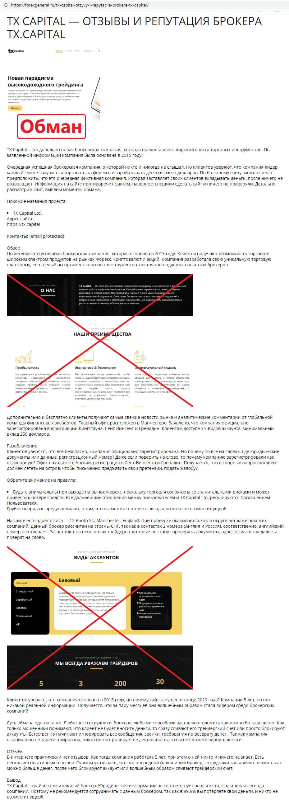 На информационном интернет-сервисе forexgeneral ru отыскана статья о мошеннической организации TX Capital, которая является еще одним подтверждением тому, что данная скам-контора - очередной обман во всемирной паутине. Обещания данного скам-брокера ничем не отличаются от того, что рассказывают подобные компании.