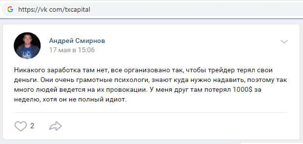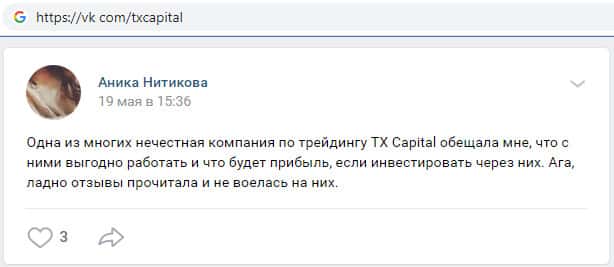 На онлайн-ресурсе vk com замечен отзыв об аферистах TX Capital, автор которого некая Аника пишет, что менеджеры данной скам-конторы рассказывают сказки о том, что с ними якобы выгодно работать и можно получить хорошую прибыль. На самом деле это далеко не так. Аналогичных компаний во всемирной паутине развелось очень много.
