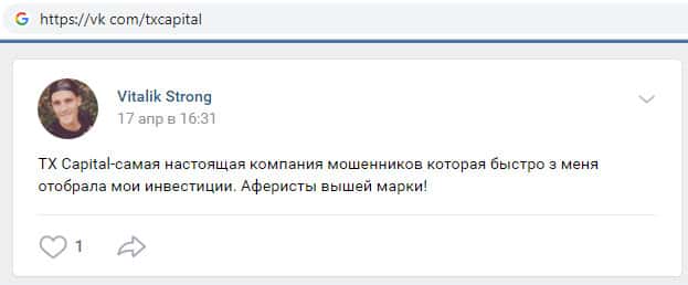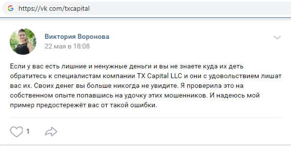 На сайте Вконтакте Ком обнаружен пользовательский отзыв о жуликах ТХ Капитал. Автор данного комментария некая Виктория пишет, что проверила на собственном опыте то, как действуют аферисты и поняла, что вложив свои денежные средства на сайте скам-организации TX Capital, Вы их больше никогда не увидите.