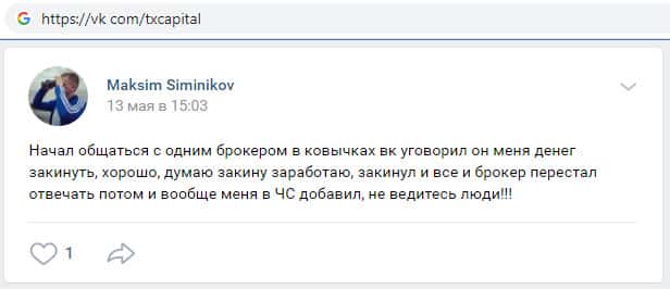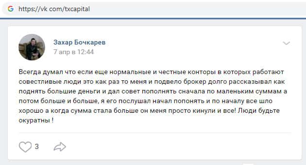 На интернет-портале Вконтакте Ком найден отзыв о скам-конторе ТХ Капитал, автор которого пишет, что мошенники отобрали все его инвестиции. Будьте бдителльны и учитесь на чужих ошибках. Не регистрируйтесь на сайте сомнительной псевдо-брокерской организации TX Capital !!!