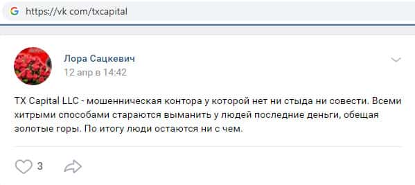 На веб-сайте vk com расположен отзыв о псевдо-брокерской конторе TX Capital. Автор данного комментария некая Лора уведомляет о том, что данная скам-организация применяет все возможные способы для того, чтобы выманить последние денежные средства у клиента, при этом вешая лапшу на уши о неплохой прибыли.