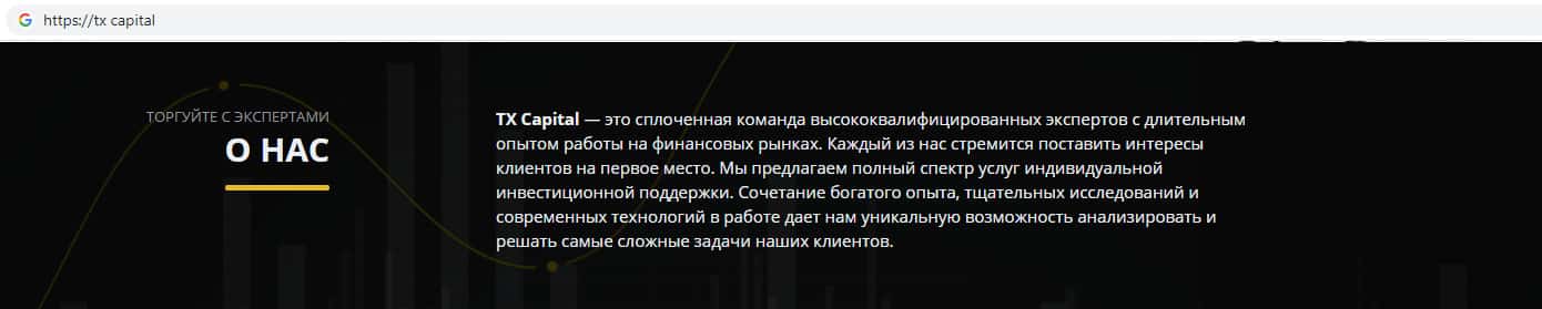 Жулики ТХ Капитал на своем фальшивом сайте опубликовывают совершенно не правдивую информацию, которая не имеет никакого отношения к реальной деятельности скам-компании. Имеется ввиду тот факт, что мошенники TX Capital не имеют никакого отношения к международному финансовому рынку.