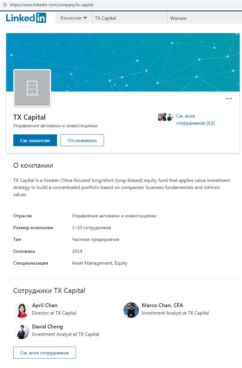 Аферисты TX Capital зарегистрировались в социальной сети linkedin com, при помощи которой заманивают на свой сайт под предлогом возможности работы в компании. Не ведитесь на развод со стороны жуликов ТХ Капитал, поскольку в действительности на их дырявом сайте нет никаких вакансий.