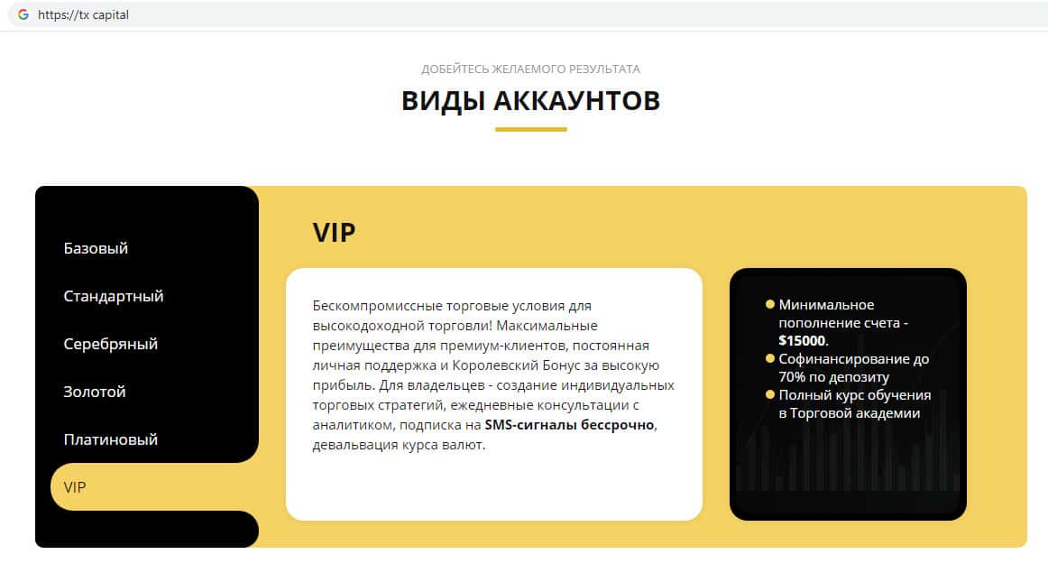 Виды торговых аккаунтов представленных на сайте скам-брокера ТХ Капитал