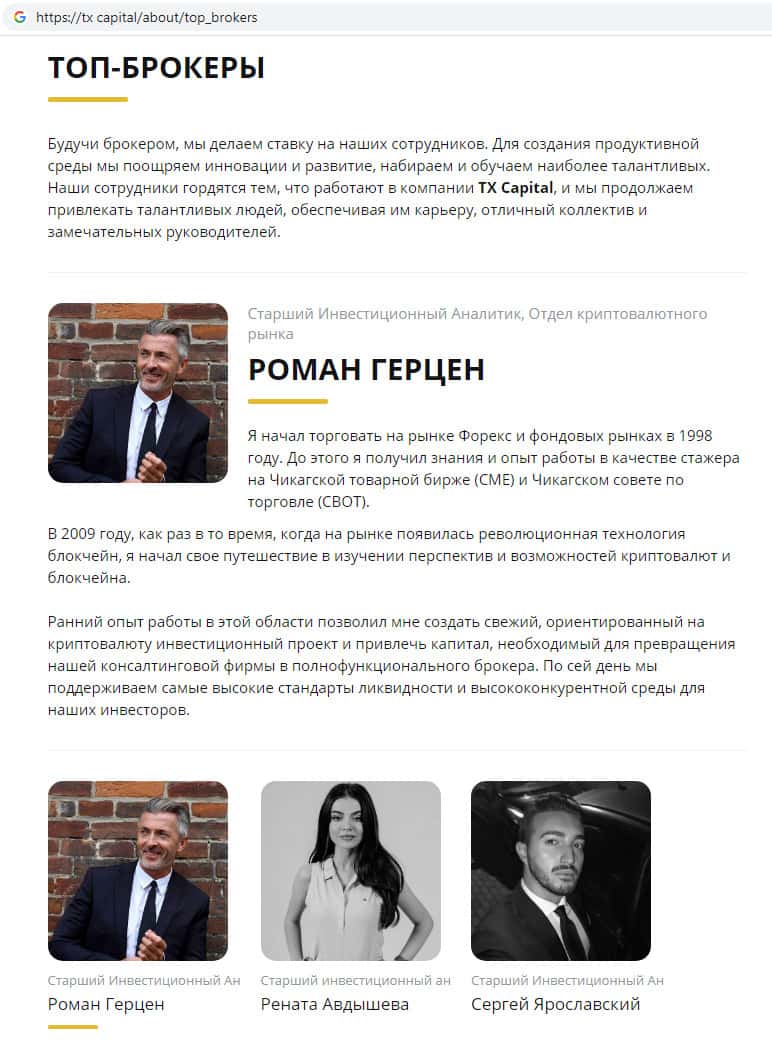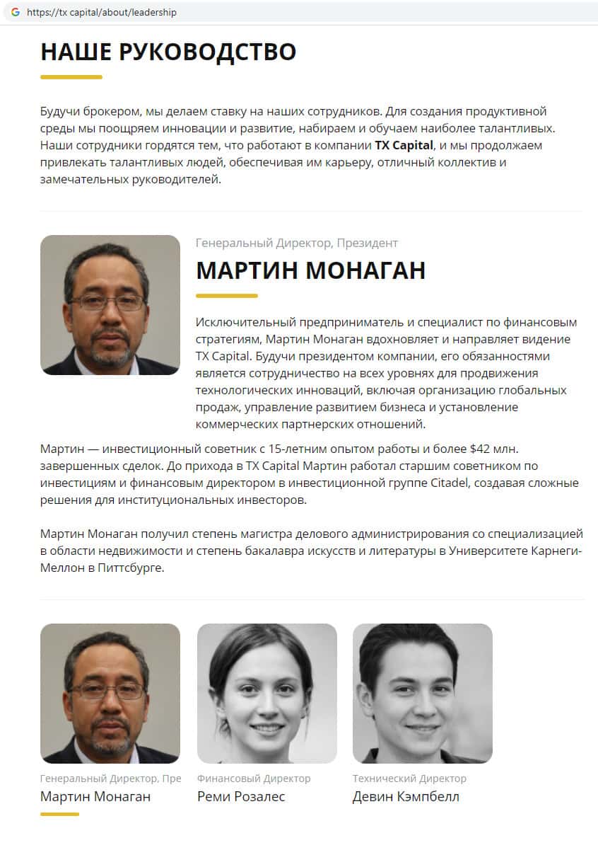 Аферисты TX Capital на своем официальном сайте разместили информацию о руководстве компании. К сожалению достоверность предоставленной ими информации проверить невозможно, поскольку во всемирной паутине достаточно подобных скам-компаний, которые размещают не правдивую информацию о якобы руководителях конторы.