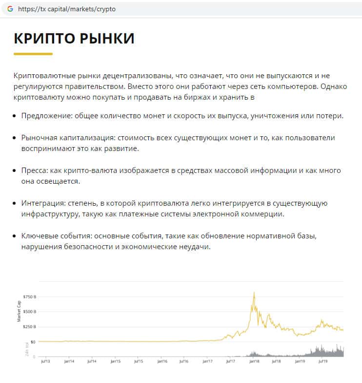 Так же аферисты TX Capital пытаются заманить на свой дырявый сайт тем, что предлагают торговать криптовалютами, что само по себе очень рискованное дело. На самом деле в торговой платформе данной скам-компании все графики нарисованные и соответственно реальная торговля на рынке Форекс не происходит.