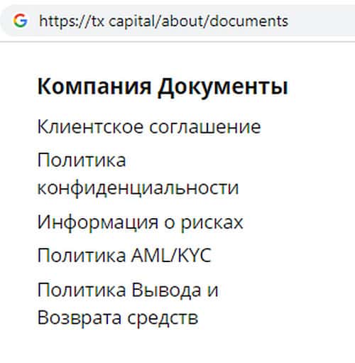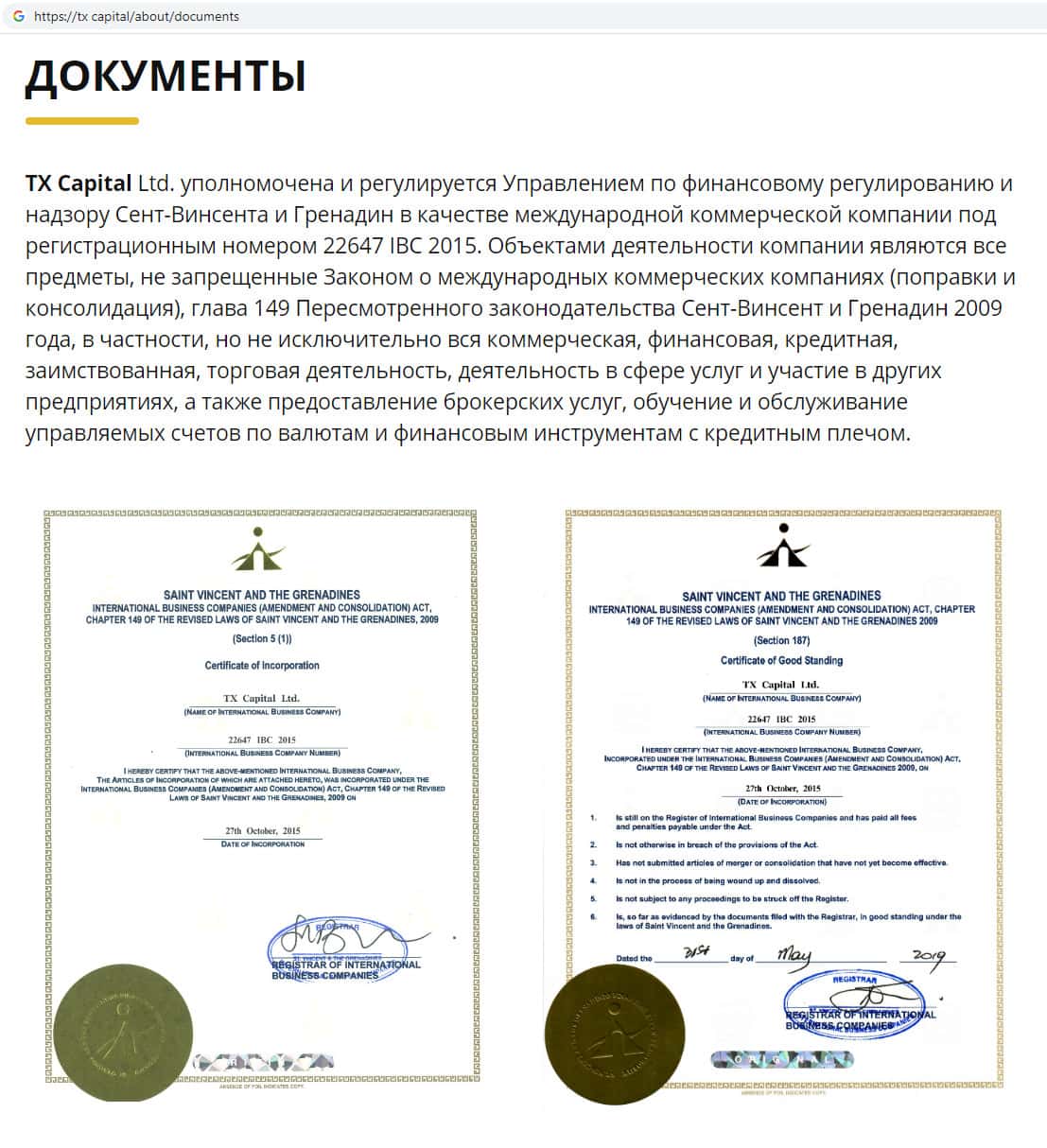 Какие документы предоставили аферисты TX Capital на своем дырявом сайте?
