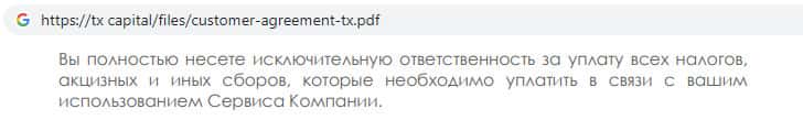 Аферисты TX Capital утверждают, что клиент обязан оплачивать налоги, комиссии, страховку и иные сборы якобы за пользование их сайтом. В действительности это развод чистой воды и оплатив выше перечисленные услуги Вы все равно не получите свои денежные средства обратно.