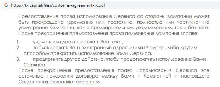 Жулики ТХ Капитал так же в данном документе уведомляют пользователей о том, что компания вправе на любом этапе приостановить обслуживание клиента и заблокировать торговый счет. Причиной тому может быть якобы мошенничество со стороны пользователя. Так что читайте внимательно всю информацию, прежде чем связаться с сомнительной конторой TX Capital !!!