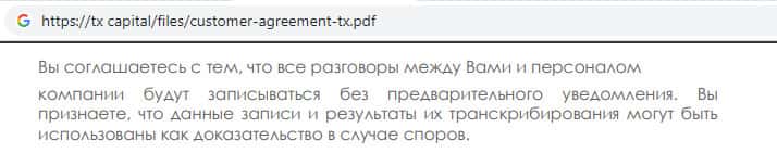 Разговаривая по телефону с жуликами TX Capital будьте уверенны в том, что представители данной шараги подстрахуются и запишут весь разговор на диктофон. Из этого следует вывод о том, что о конфиденциальности Ваших данных можете забыть. Верить подобным скам-компаниям ни в коем случае нельзя !!!