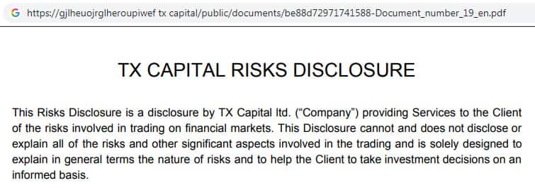 В уведомлении о рисках скам-организация TX Capital указывает о том, что торговля на сайте сопряжена определенным уровнем риска. Соответственно данная брокерская компания не несет никакой ответственности за деньги утраченные клиентом на их фальшивом сайте. В данном случае шулера ТХ Капитал ссылаются на ошибочный выбор торговой стратегии клиента.
