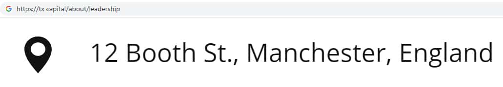 Согласно контактной информации, которую указывает о себе скам-организация ТХ Капитал, главный офис которой находится в городе Манчестер, который находится на северо-западе Англии. Где ныне базируется огромное количество аналогичных компаний.