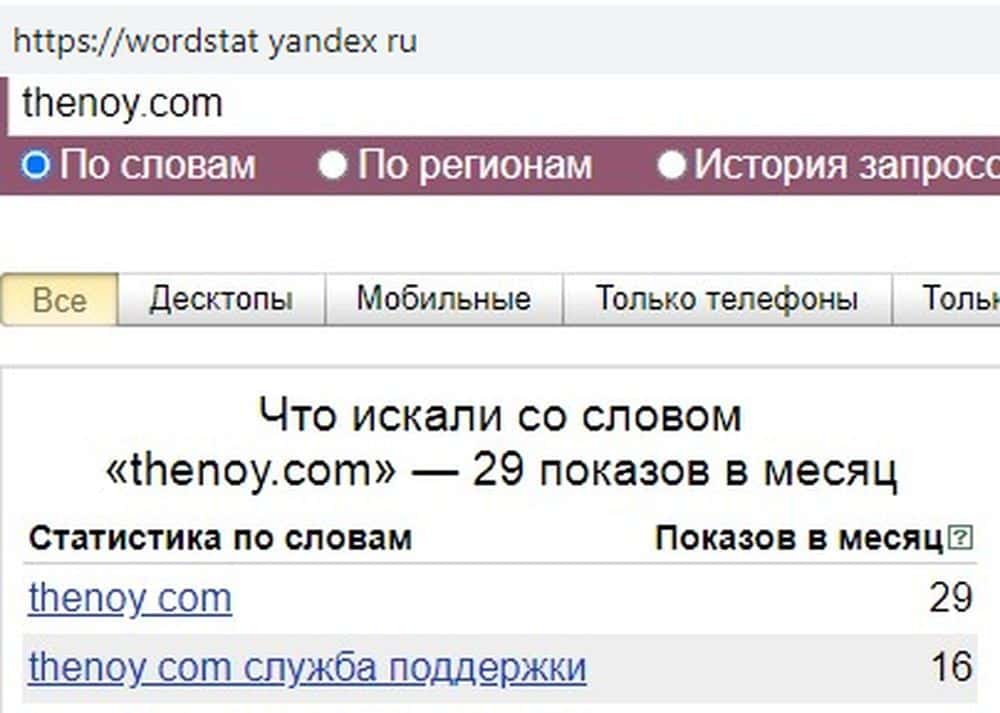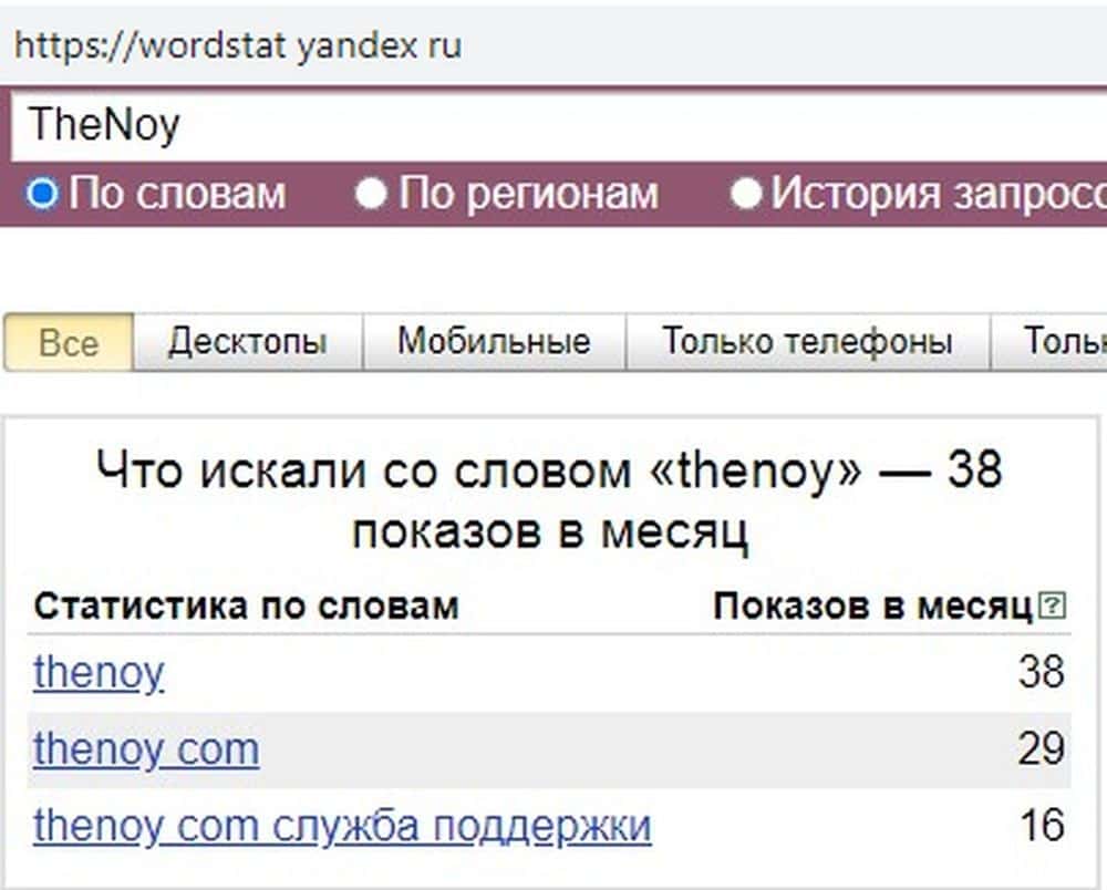 Шарлатаны TheNoy популярностью в сети не пользуются. По запросу "thenoy.com" в месяц было всего 29 показов, и то, эти люди пытались отыскать несуществующую службу поддержки.
