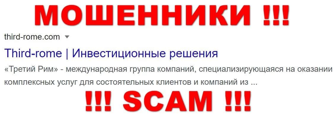 Third-Rome - очередной псведо-инвестиционный проект оффшорного происхождения, а также пропиской в России. Мошенники берут деньги в управление путем предоставления липовых консалтинговых услуг. Также есть некоторая информация о связи этого лохотрона с известной шарагой Бит Коган и соскамленной конторой Антанта Капитал. Многие инвесторы уже поняли, что вложенные средства уже не вернуть, поэтому мы настоятельно не рекомендуем связываться с аферистами ООО Третий Рим!!!
