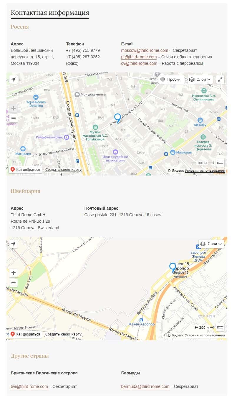 По поводу контактных данных конторы Third-Rome, так на своем официальном сайте они указали номера телефонов, электронные почты и даже адреса своих главных офисов: