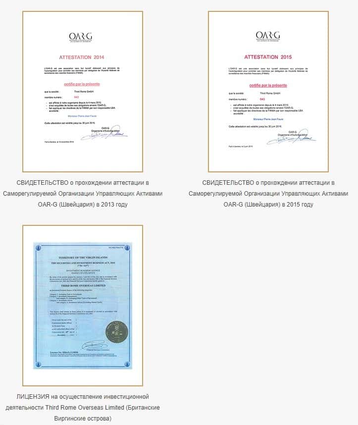 По поводу лицензий, контора Third-Rome на портале разместила несколько скриншотов, которые якобы должны подтверждать их регулируемость, но это обыкновенные подделки.