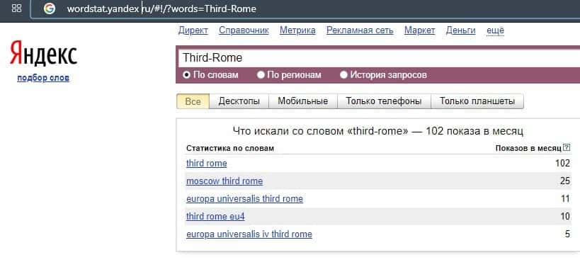 Что касается запроса самого сайта мошенников "third-rome.com" так здесь еще хуже ситуация. Всего 1 запрос за последний месяц выдала поисковая система Яндекс.