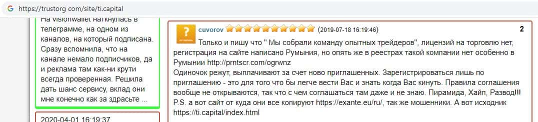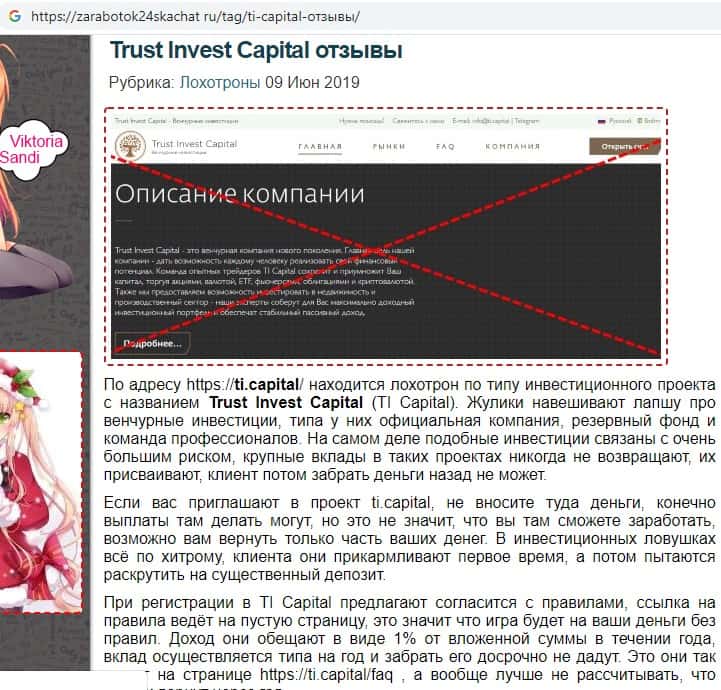 На изображении, расположенном ниже, вы можете наглядно увидеть и прочесть о мошеннической и противозаконной деятельности лохотрона TI Capital, в котором опытный трейдер делится своим опытом и не рекомендует иметь дело с жульем Траст Инвест Капитал. Так как кроме потери вложенных денег, времени и нервов вы ничего не получите.