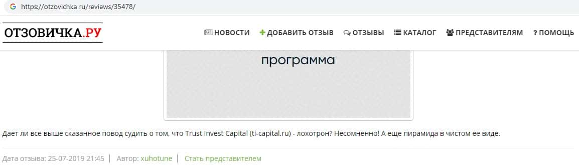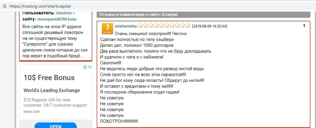 - Отзыв реального пользователя в сети о кухне лохотроншиков TI Capital