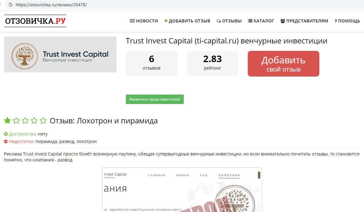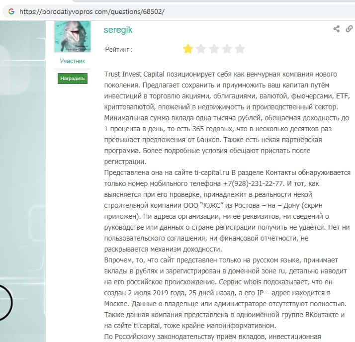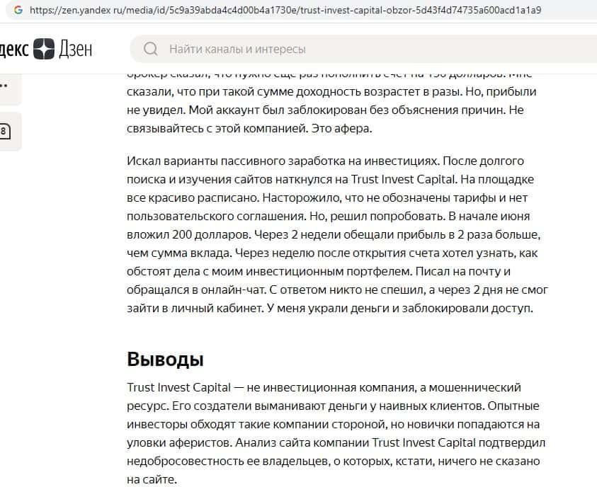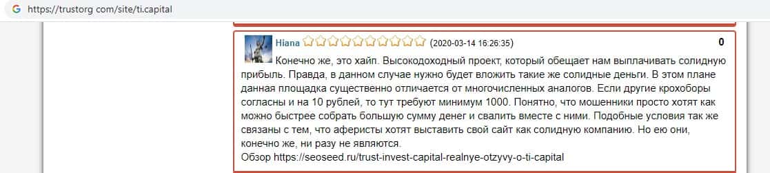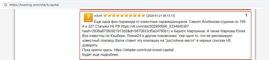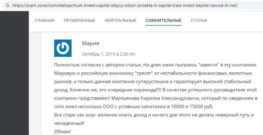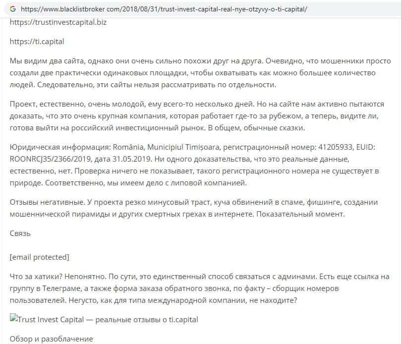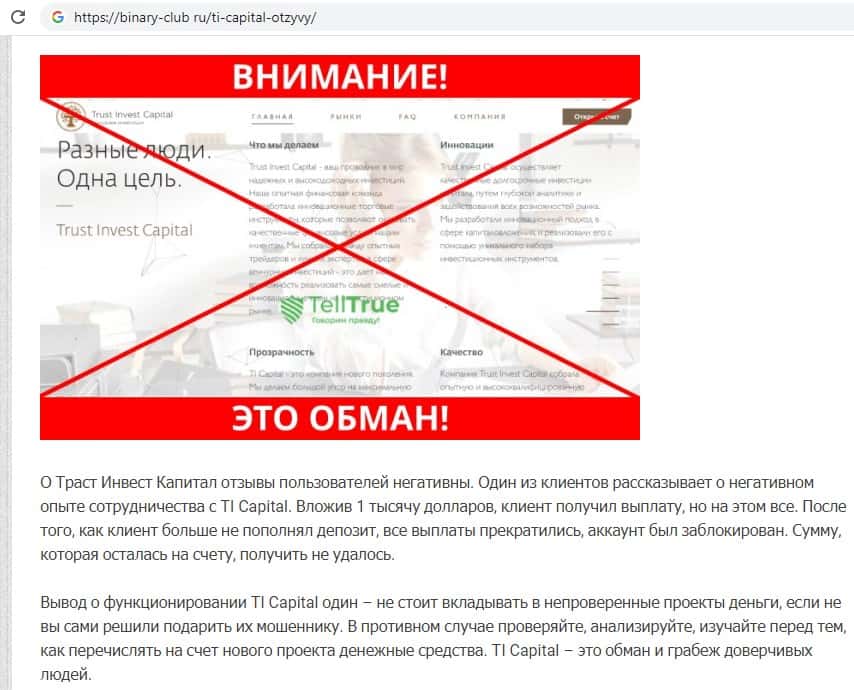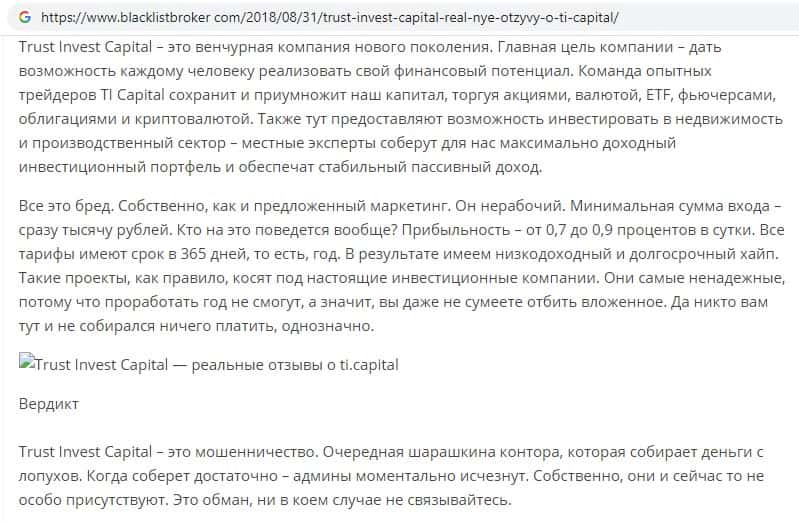 Ниже вы можете увидеть и прочесть реальный негативный вывод в сторону аферистов TI Capital, который связан с тем, что они под предлогом типичной и банальной лапши на уши разводят очередного наивного пользователя сети интернет, после чего шулера Траст Инвест Капитал оперативно дают заднюю и отказываются от любой ответственности.