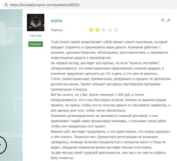 - Негативный отзыв о непрозрачности компании Траст Инвест Капитал