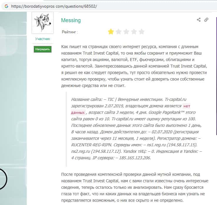 На изображении, расположенном ниже, вы можете увидеть и прочесть выводы эксперта о сайта мошенников TI Capital, в котором комментатор определенно не рекомендует иметь дело с шулерами Траст Инвест Капитал, так как это очередной липовый и банальный развод наивных пользователей сети интернет на деньги, а не форекс брокер.