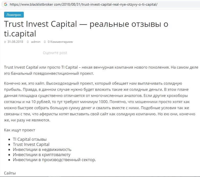 - Статья в сети Интернет про наглые разводы и жуликов TI Capital в том числе
