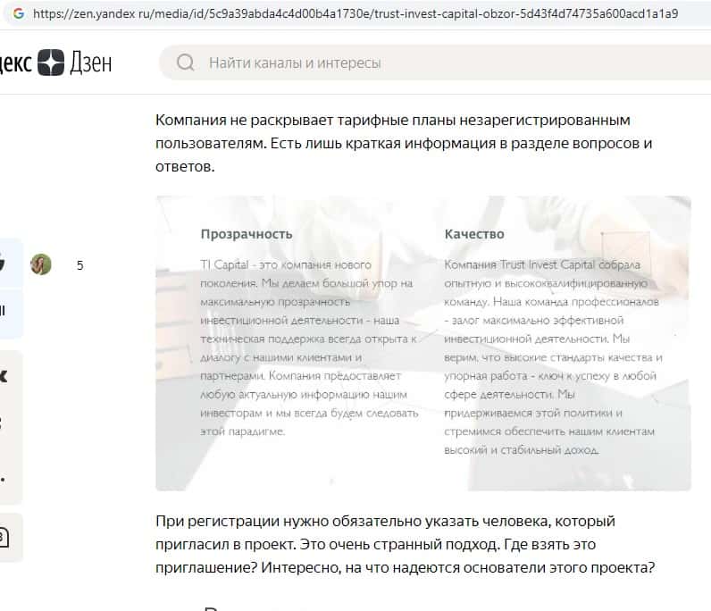 Как можно здесь увидеть Траст Инвест Капитал не хочет раскрывать то как она зарабатывает, кто её курирует. Нет лицензионного соглашения которое в принципе должно быть, но его нет в свободном доступе даже для трейдеров которые вложились в TI Capital. Не вкладывайте в Траст Инвест Капитал сплошной лохотрон и самая настоящая пирамида.