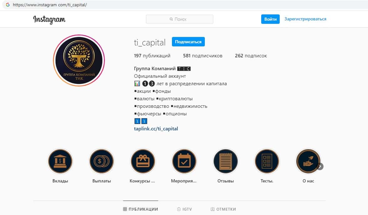 Для размещения различных заманчивых постов с лапшой на уши наивной клиентуре аферисты TI Capital обзавелись страницей в социальной сети Инстаграм, где у мошенников Траст Инвест Капитал имеется около 581 подписчика. На изображении, расположенном ниже, вы можете увидеть страницу аферистов TI Capital на площадке Инстаграм.