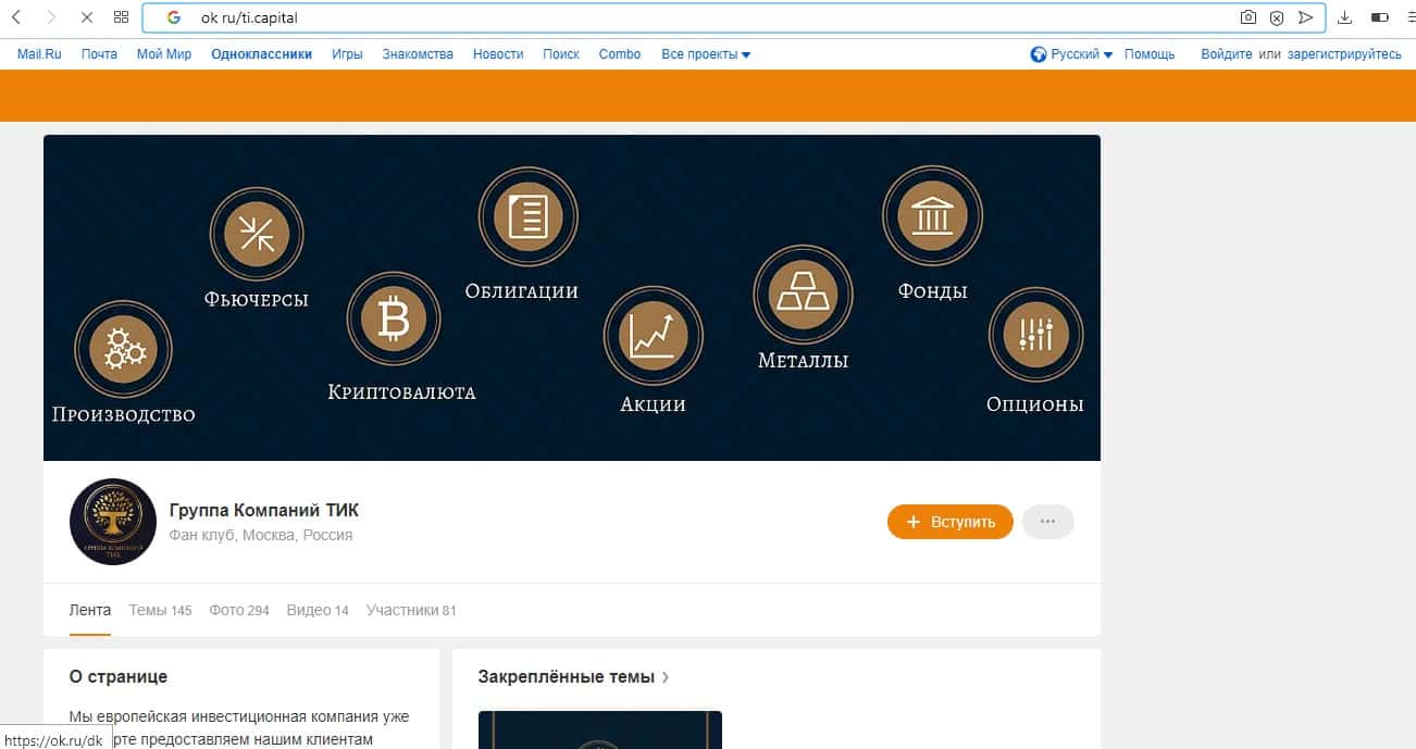 Ну и конечно же канал в социальной сети Одноклассники. Аферисты Траст Инвест Капитал набрали около 81 подписчика, что является скудным результатом для крупной биржи. Видимо с маркетингом у них все очень печально, поэтому и мы не советуем переходить по ссылке на данную социальную сеть, и тем более сотрудничать с кухней TI Capital.