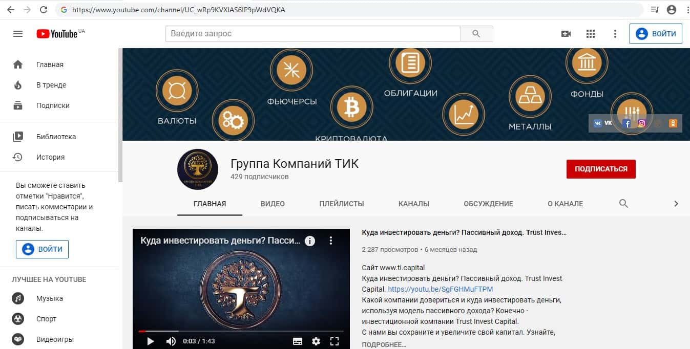 Для размещения различных заманчивых постов с лапшой на уши наивной клиентуре аферисты Траст Инвест Капитал обзавелись страницами в социальных сетях Инстаграм, ВКонтакте, Одноклассники, Ютуб, Твитер и Фейсбук. На изображении, расположенном ниже, вы можете увидеть страницу аферистов TI Capital на площадке.