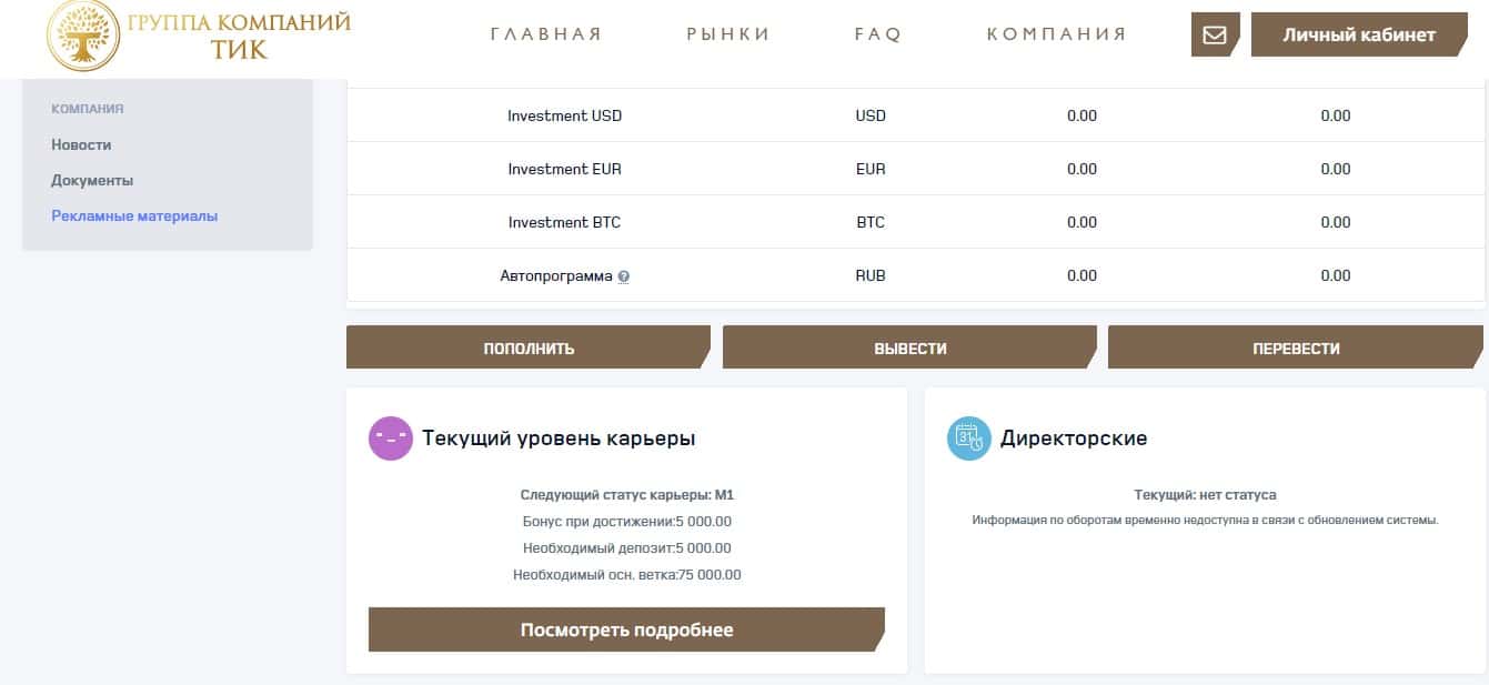 Сделав первый вклад трейдер рассчитывает на то, что с ним будут обращаться не как с холопом а как с хорошим вкладчиком и получать пассивный доход. Но в итоге TI Capital настолько зажравшаяся кухня лохотроншиков, что даже в личном кабинете нет ничего, что могло помочь разобраться трейдеру.
