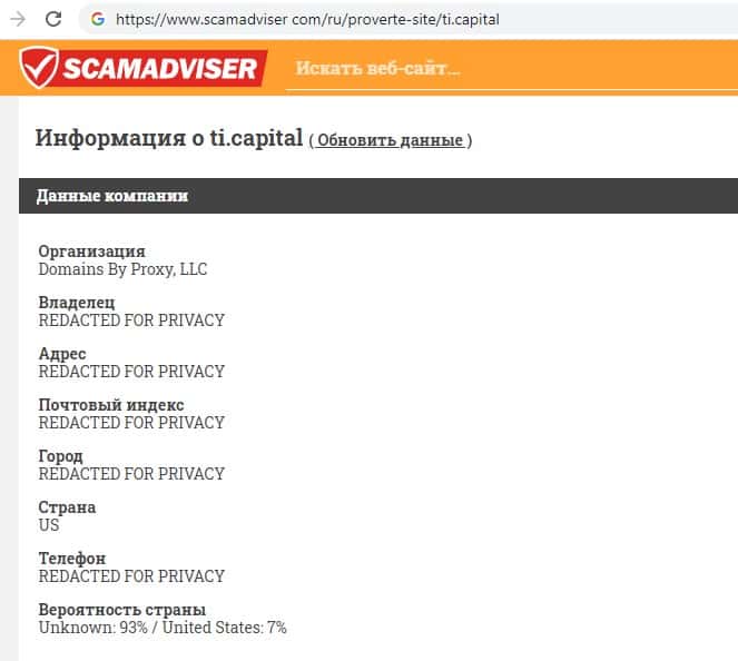 В связи с мошеннической и противозаконной деятельностью лохотрона Траст Инвест Капитал его реальные руководители предпочитают анонимность дабы избежать ответственности со стороны правоохранительных органов. Техническую же информацию о сайте жулья TI Capital можно узнать с помощью портала scamadviser com, что можно увидеть на изображении ниже.